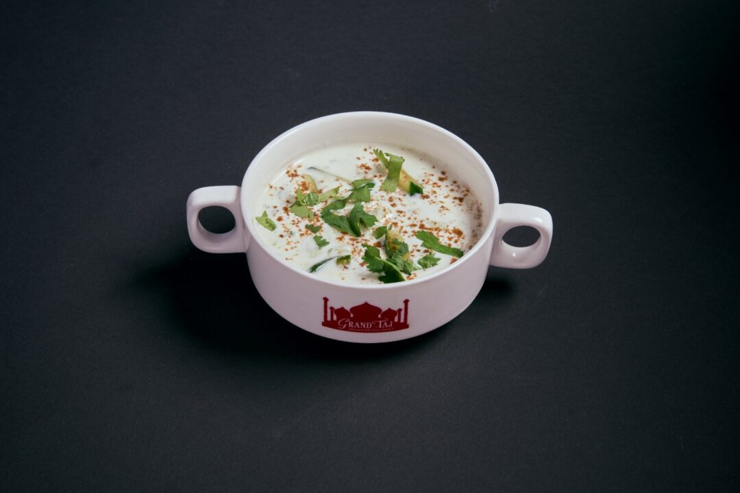 Yoghurt tilsatt med hakket agurk, løk, tomater og lett krydret. Yoghurt with chopped cucumber, onions, tomatoes and spices. *Lactose